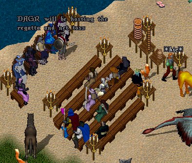 Regatta race this Wedsnday night (Sep 20) at 8 pm est. Come join the race and a chance to win prizes. The race will begin on Trinsic's dock in trammel. There are no entrance fees and the more racers the merrier. The prizes are as follow; 1st place recieves 50,000gp, 2nd place recieves 25,000gp, 3rd place 10,000gp. There shall be referees posted in strategic points along the race both on land and in the water to insure there is no cheating. Rules to follow: